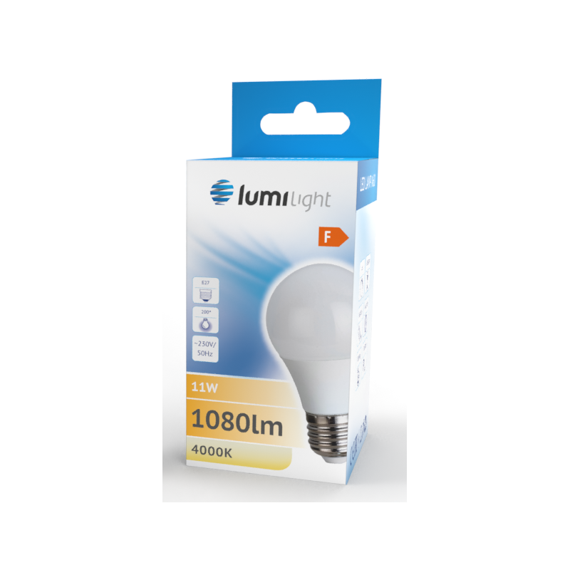 Żarówka LED z trzonkiem E27 odpowiednik żarówki tradycyjnej o takim samym trzonku. A60 oznacza kształt żarówki tradycyjnej. Zasilana napięciem 230V przemiennym. Dostępna o mocy 11W w barwie neutralnej.
