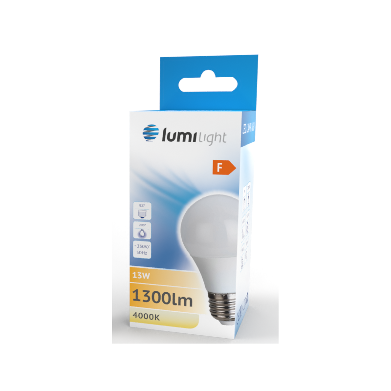 Źródło światła LED 13W o trzonku E27 oraz o kształcie tradycyjnej szklanej żarówki. Charakteryzuje się wysoką skutecznością świetlną. Jest jeszcze bardziej energooszczędne dzięki zastosowaniu trwałych diod LED, które zużywają bardzo mało energii elektrycznej. Szeroki kąt świecenia 360° zapewnia równomierne oświetlenie pomieszczeń. Żarówki dostępne są w barwie ciepłej, neutralnej i zimnej.