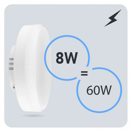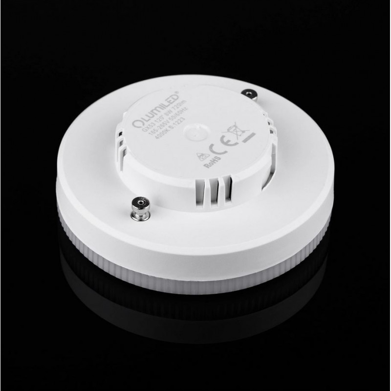 Żarówka LUMLED GX53 8W to doskonały zamiennik tradycyjnych źródeł światła o mocy 60W, oferujący strumień świetlny 720 lm przy zużyciu jedynie 8W energii. Dzięki wysokiej skuteczności świetlnej 90 lm/W zapewnia optymalne oświetlenie, jednocześnie minimalizując rachunki za prąd.