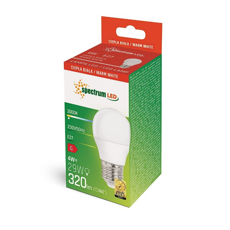 Żarówka KULKA E27 jest wyposażona w trzonek E27, który jest jednym z najpopularniejszych rodzajów mocowań w żarówkach, co zapewnia jej wszechstronność i kompatybilność z wieloma oprawami oświetleniowymi dostępnymi na rynku. Jej napięcie to 230 V, co jest standardem dla większości instalacji oświetleniowych w domach. Kąt rozsyłu światła wynoszący 160° zapewnia szerokie rozpraszanie światła, co przekłada się na równomierne oświetlenie pomieszczeń. Taki szeroki kąt rozsyłu jest korzystny w kontekście oświetlenia ogólnego, gdzie równomierne rozproszenie światła jest istotne dla komfortu i funkcjonalności.