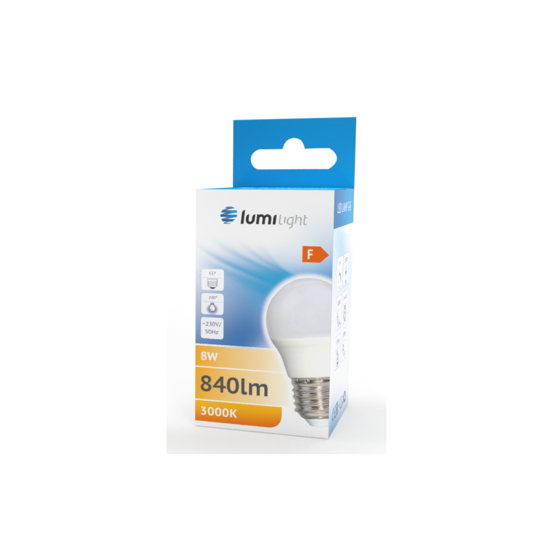 Żarówka LED z trzonkiem E27 odpowiednik żarówki tradycyjnej o takim samym trzonku. G45 oznacza kształt kulki. Zasilana napięciem 230V przemiennym. Dostępna o mocy 8W w barwie ciepłej i neutralnej.