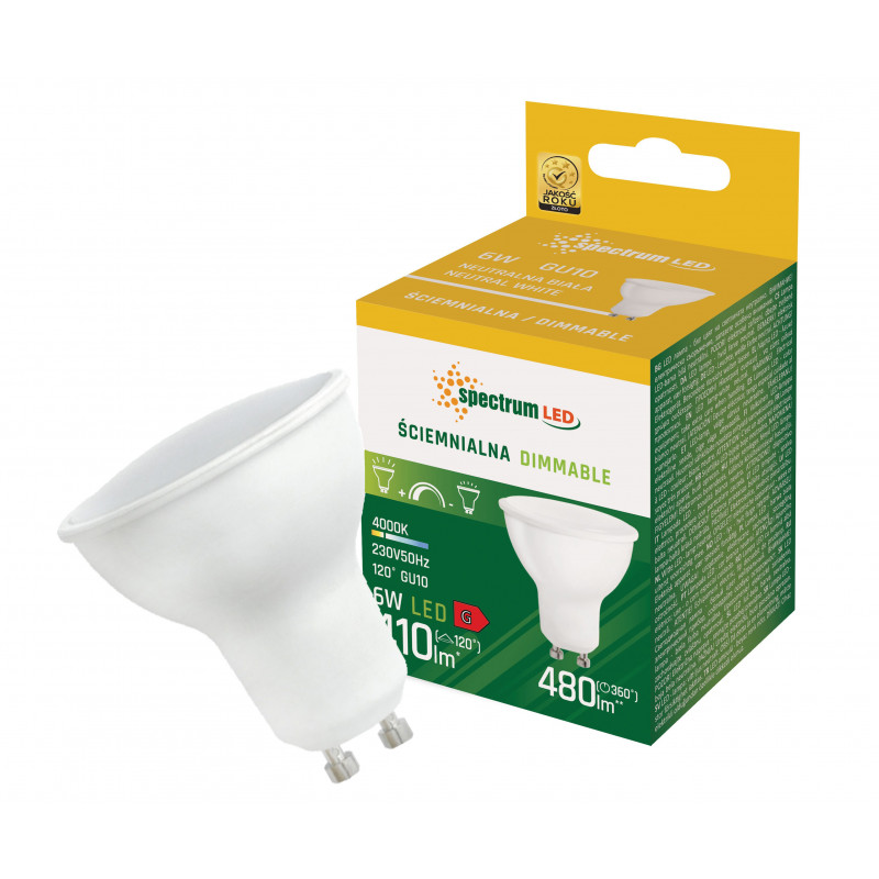 Ściemnialne źródło światła LED GU10 6W z popularnym mocowaniem na GU10 oraz o klasycznym kształcie. Świeci światłem o neutralnej - najbardziej uniwersalnej barwie (4000K), które sprawdzi się w pomieszczeniach, z których korzystamy na co dzień, zapewniając komfort podczas codziennych czynności.