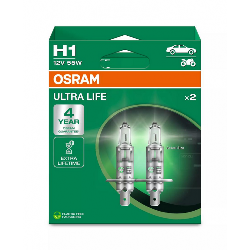 OSRAM ULTRA LIFE wyróżniają się srebrną główką, która podkreśla nowoczesny wygląd reflektora. Standardowy trzonek P14.5s ułatwia wymianę i zapewnia szeroką kompatybilność z różnymi modelami pojazdów. Pasują do reflektorów halogenowych typu H1.