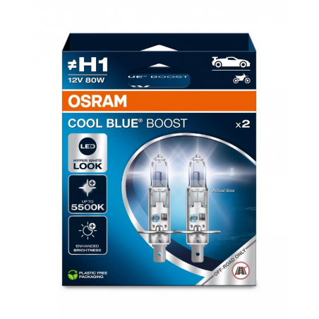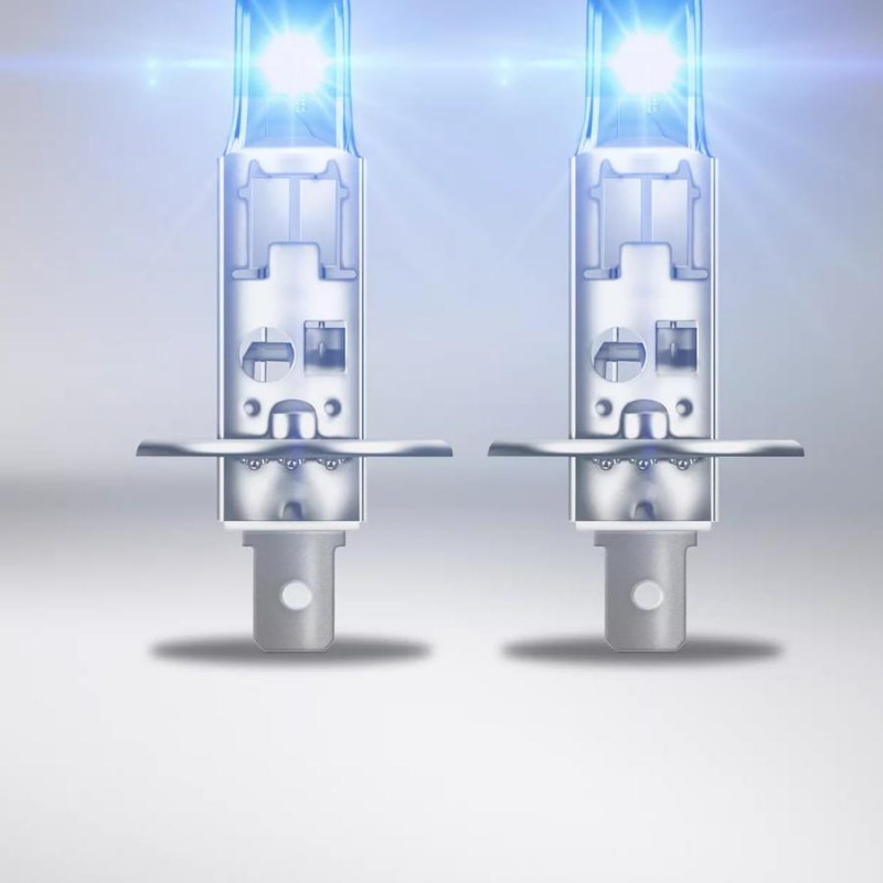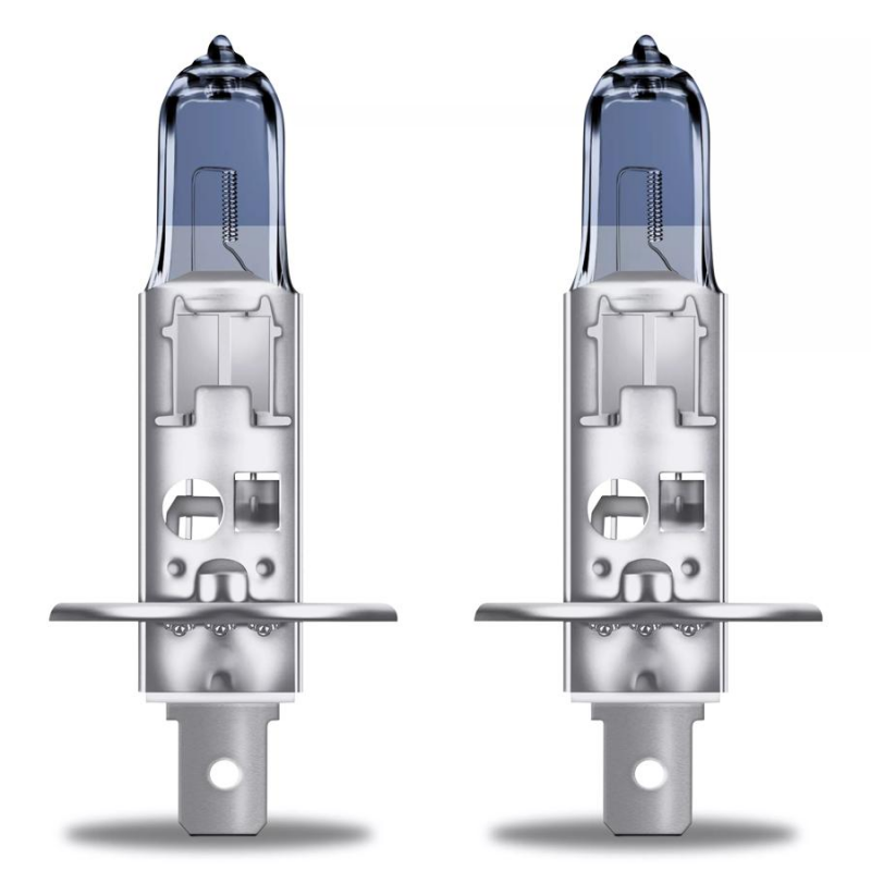 Żarówki OSRAM COOL BLUE BOOST H1 oferują wyjątkowo białe światło o temperaturze barwowej do 5500 K, które przypomina oświetlenie LED. Dzięki specjalnej konstrukcji generują większą jasność niż standardowe żarówki halogenowe, zapewniając dynamiczny i nowoczesny wygląd reflektorów.