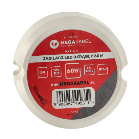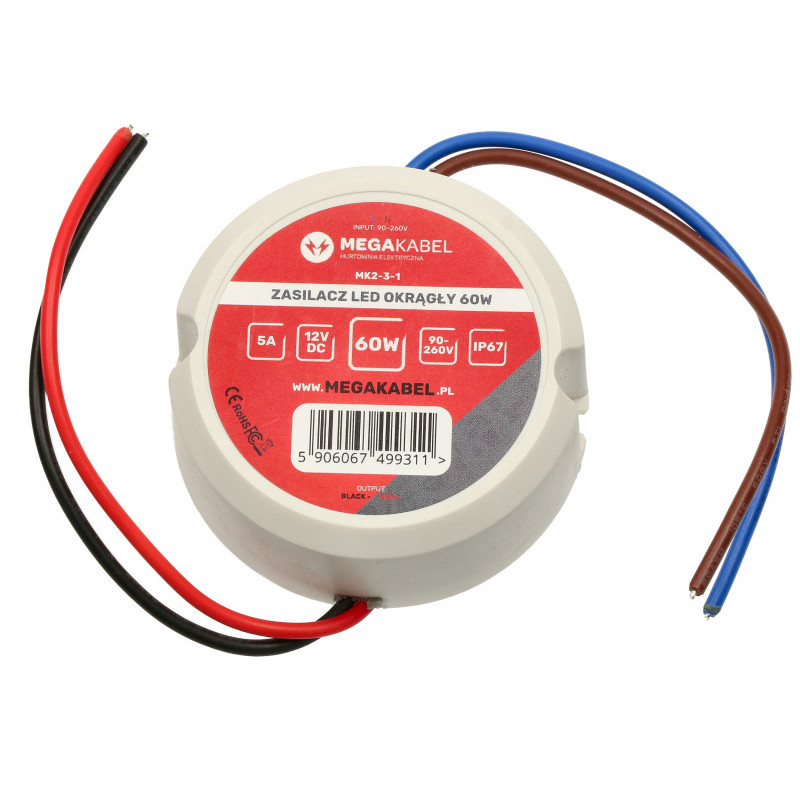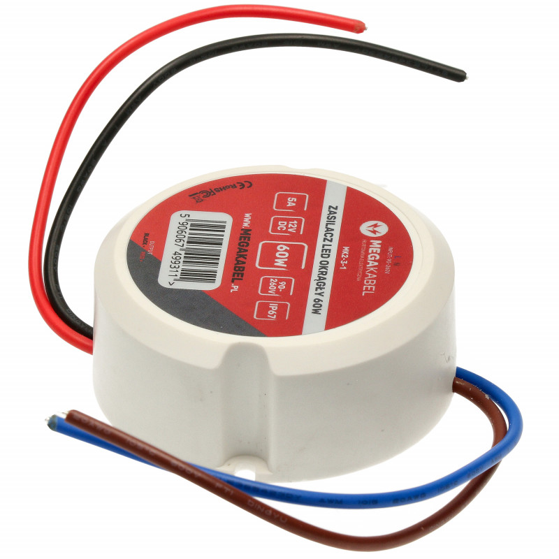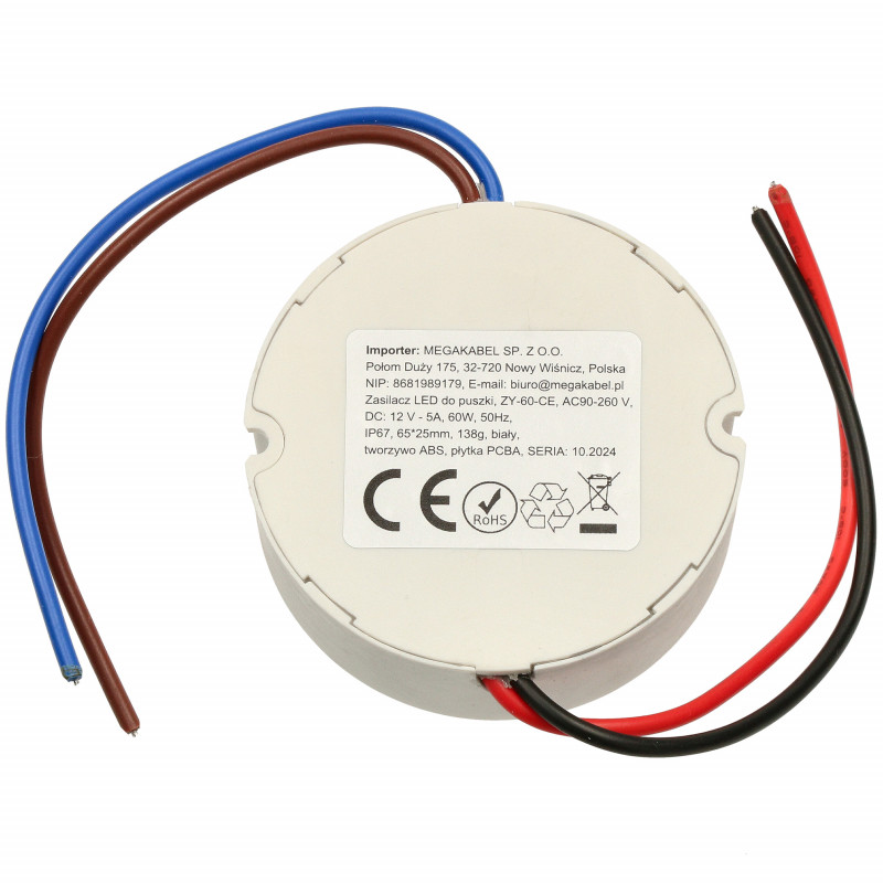 Zasilacz MEGAKABEL ZY-60-CE to doskonałe źródło zasilania dla nowoczesnych instalacji LED. Z mocą 60W i napięciem wyjściowym 12V DC, sprawdzi się wszędzie tam, gdzie potrzebna jest niezawodność i estetyczne ukrycie zasilania – bezpośrednio w puszce instalacyjnej o średnicy minimum 70 mm.