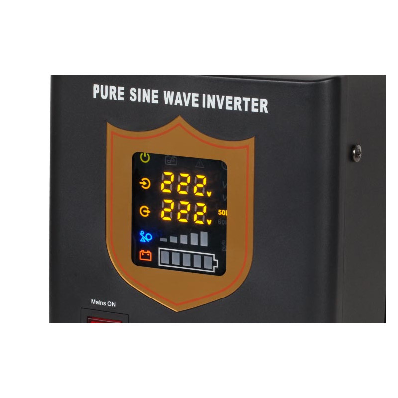Awaryjne zasilacze KEMOT PROSinus wyposażone są w przejrzysty wyświetlacz LED, który wskaże aktualny status pracy urządzenia. Na wyświetlaczu skontrolujesz m.in. poziom napięcia wejściowego, wyjściowego i częstotliwości. Co więcej szybko sprawdzisz też poziom obciążenia i poziom naładowania baterii.