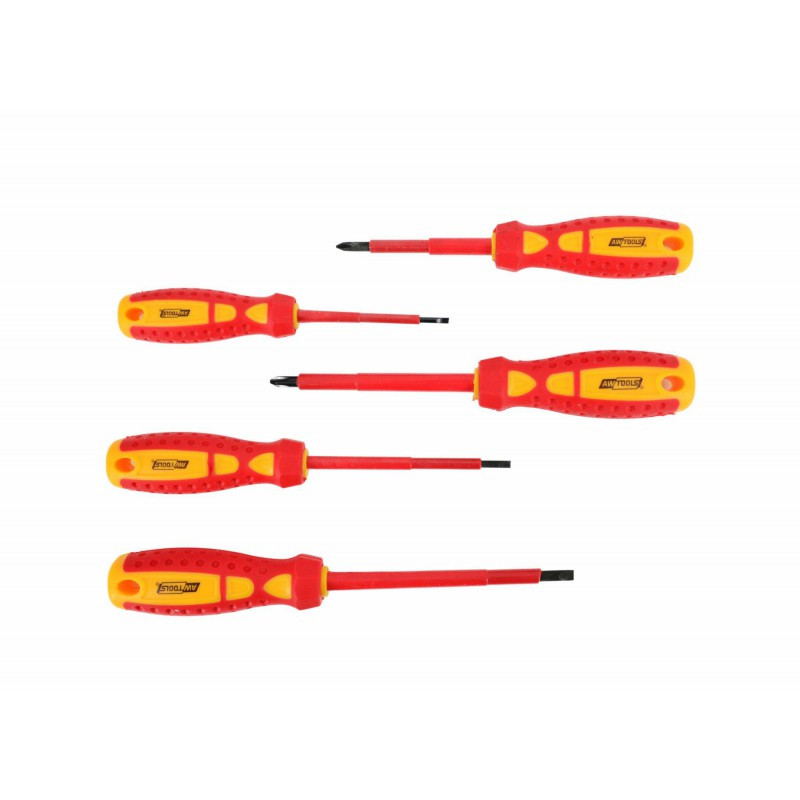 Zestaw wkrętaków izolowanych AW36985 AWTOOLS to profesjonalne narzędzie stworzone z myślą o bezpieczeństwie i wygodzie pracy w branży elektrycznej oraz motoryzacyjnej. Zestaw składa się z pięciu wkrętaków, które spełniają najwyższe standardy jakości i bezpieczeństwa. Każdy wkrętak został wykonany z stali CrV S2, co zapewnia ich trwałość i odporność na uszkodzenia. Stal ta jest dodatkowo utwardzana do twardości HRC 51-54, co gwarantuje długotrwałe użytkowanie i stabilność narzędzia podczas pracy. Magnetyczne, oksydowane groty wkrętaków są szczególnie cenione za swoje właściwości, umożliwiając pewne trzymanie śruby oraz zwiększając precyzję pracy. Oksydacja zapewnia dodatkową ochronę przed korozją, co jest istotne w trudnych warunkach roboczych.
