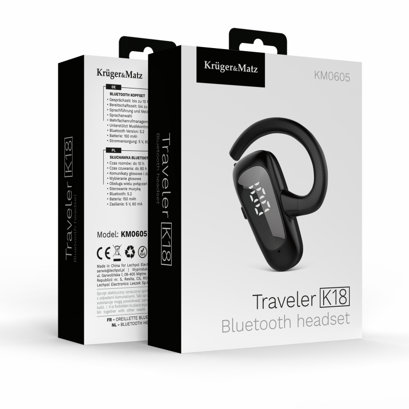 Słuchawka Bluetooth Kruger&Matz Traveler K18 to idealne rozwiązanie dla osób ceniących wygodę, mobilność i niezawodną łączność. Dzięki ergonomicznej i lekkiej konstrukcji doskonale sprawdza się podczas długich rozmów i podróży. Zastosowanie technologii Bluetooth 5.2 zapewnia stabilne połączenie i szeroki zasięg.