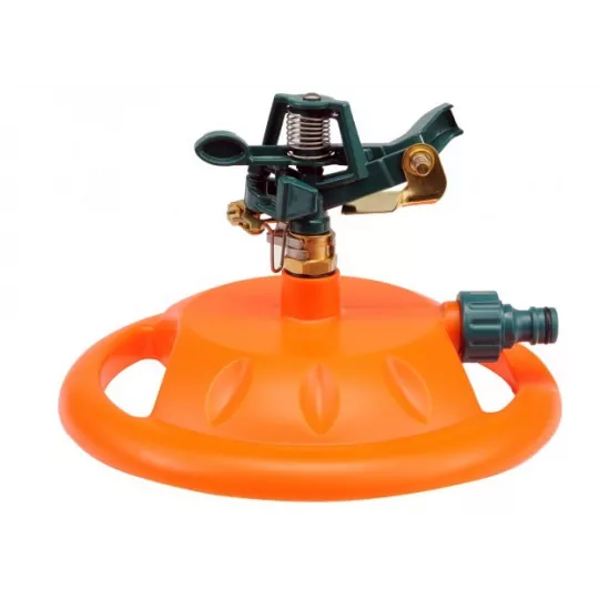 Nawet podczas długiej pracy można zablokować impulsowy wyzwalacz, co gwarantuje niezmienny przepływ wody, bez ryzyka nadwyrężenia dłoni i nadgarstka. Zasięg regulowany w zakresie 45 do 360 stopni. Podstawka o minimalnej powierzchni styku z podłożem, dzięki czemu, nie niszczy trawnika. Wyposażona w szybko złącze.